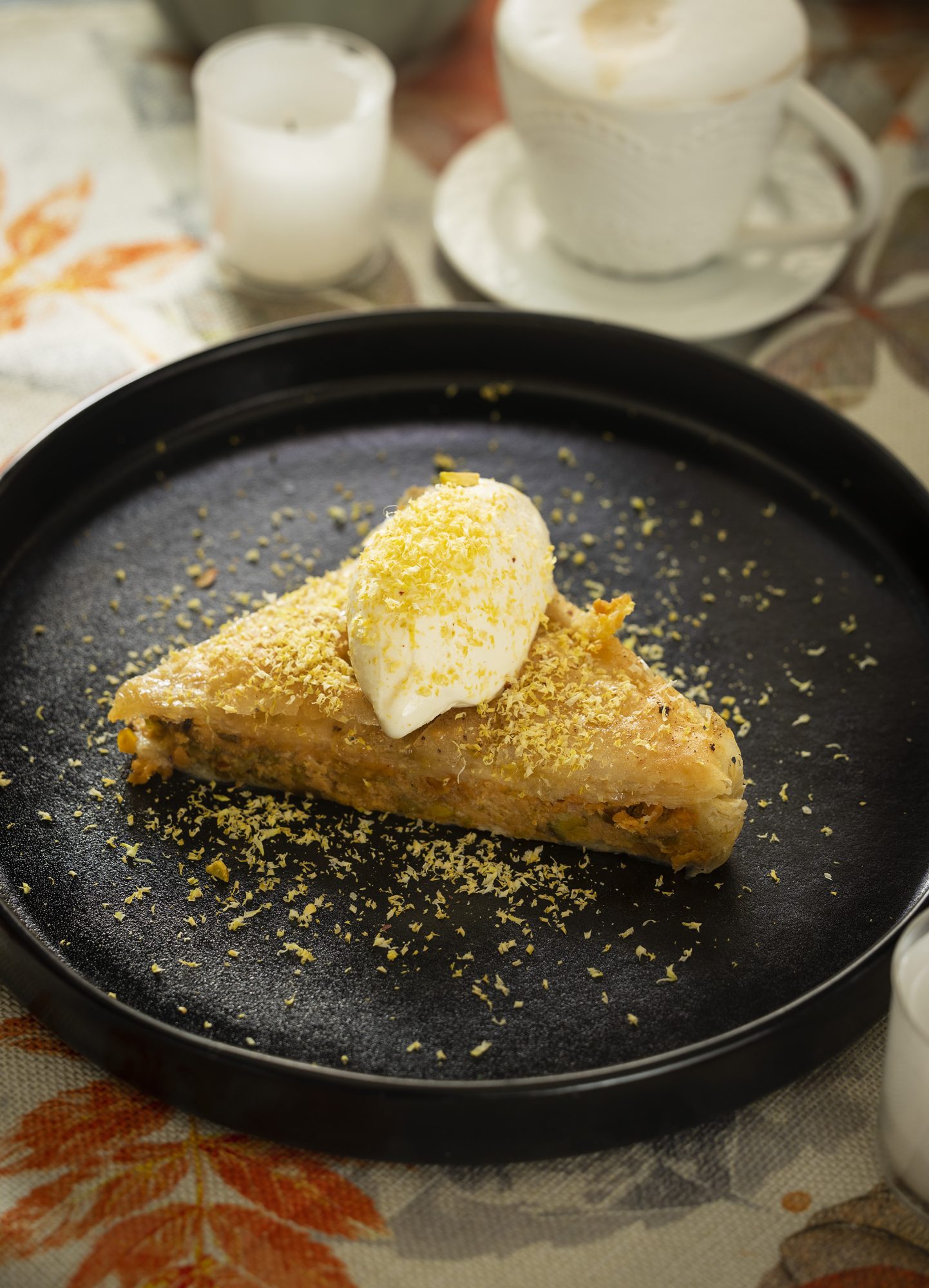 BAKLAVA DE MUERTOS: Pasta filo rellana de chongos zamoranos y pistaches, helado de vainilla y miel ($80)