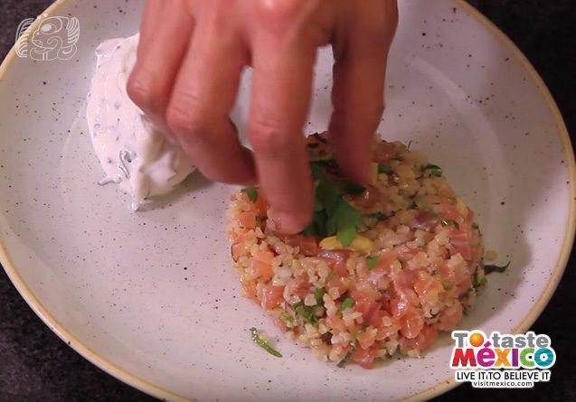 Combinar la sal y el azúcar. Colocar la mitad de la preparación sobre una charola, formando una «cama» para el salmón. Colocar el pescado y cubrir con la cebolla rebanada y más de la mezcla anterior. Cubrir con hule auto adherente y dejar curar de 4 a 5 horas. Retirar la cebolla y la preparación de sal y azúcar, enjuagar cuidadosamente en agua fría, secar y picar finamente, colocar en un tazón. Agregar el trigo cocido, el cilantro, la hierbabuena, la cebolla morada, el limón curtido, el chile serrano, el jugo de limón, el aceite de oliva y la pizca de sal. Mezclar todo, ajustar la sazón y repartir entre 8 platos. Servir con jocoque preparado con hierbabuena, 1 cucharada por porción .