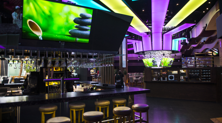 Una gran noticia para los apasionados de los deportes es la pantalla principal, compuesta a su vez por 36 pantallas que pueden transmitir una sola proyección en conjunto o varias simultáneamente. Aquí, la oferta. de platillos al carbón que brinda el restaurante CRANKER es un gran complemento mientras observamos jugar a nuestro equipo favorito.