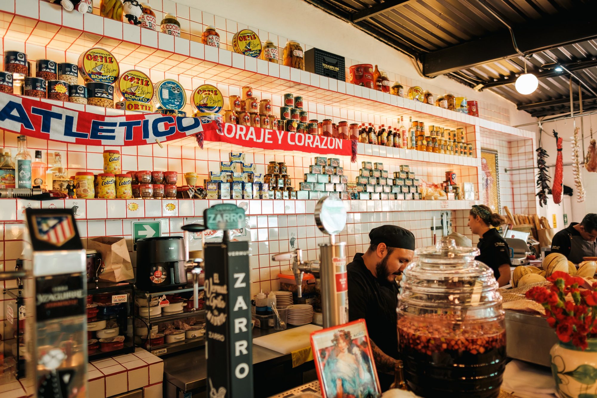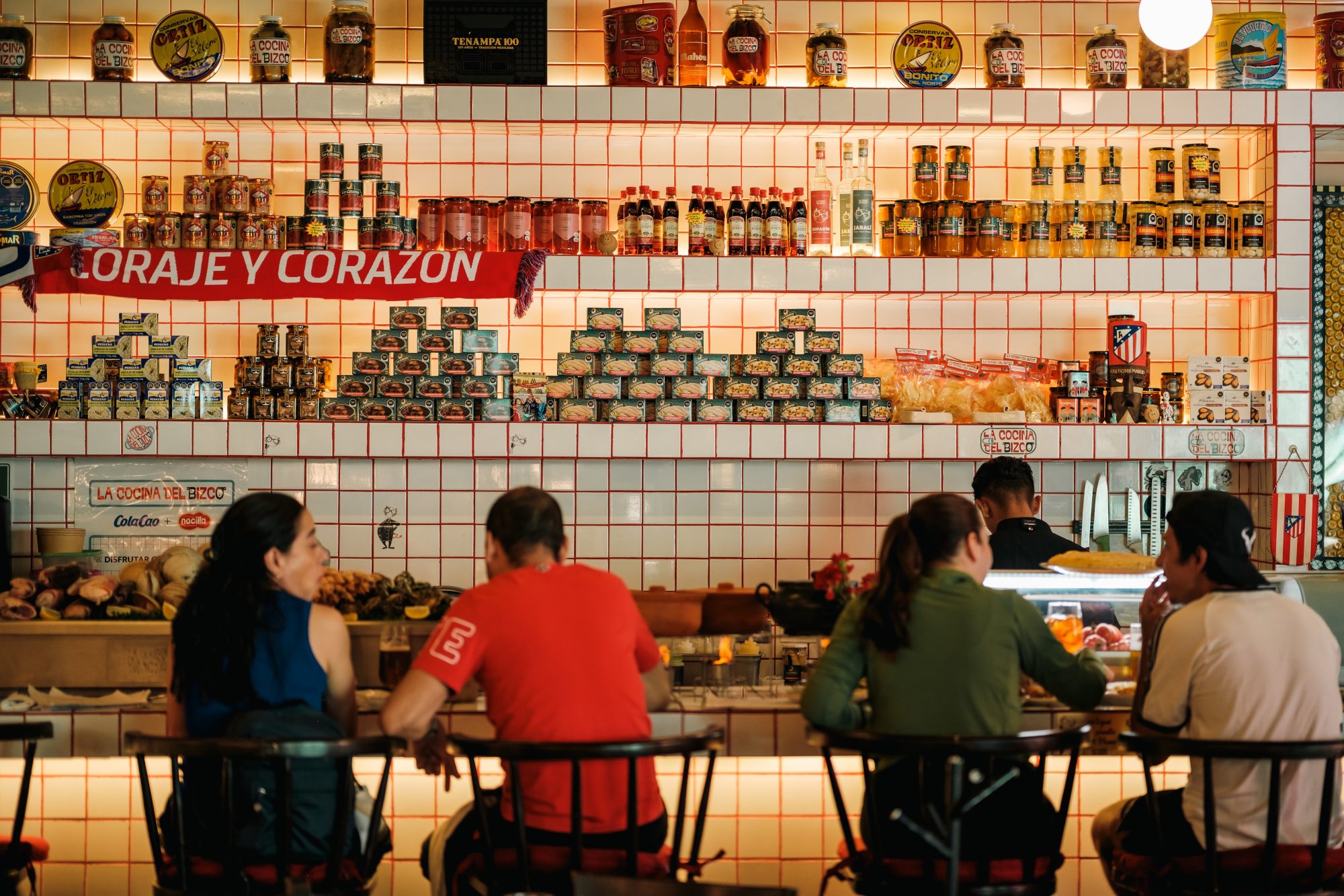 Ubicado en la colonia Condesa, La Cocina del Bizco funciona como una auténtica taberna española contemporánea. Aquí la única bandera que cuelga en el espacio es la del Atlético de Madrid, un guiño directo a la identidad del chef Jesús Pedraza, mejor conocido como “El Bizco”.
