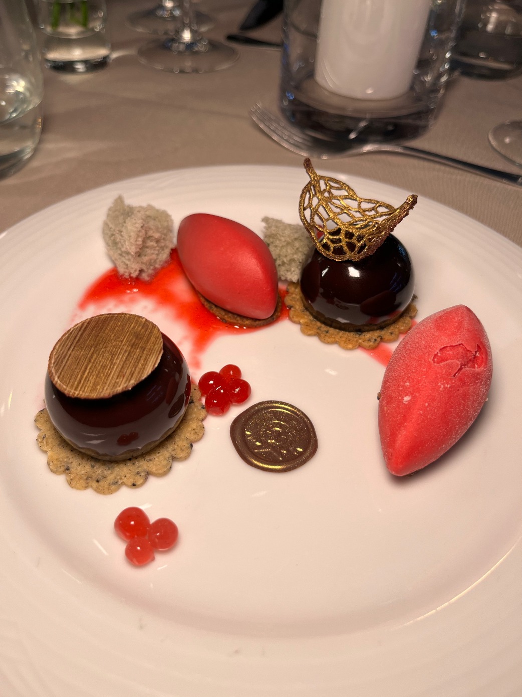 El dulce final incluyó dos postres. El primero, una mousse de chocolate 70% con namelaka de frambuesa, ajonjolí negro y sherbet de frambuesa. Y, el segundo, un helado de mantequilla caramelizada acompañado de calabaza criolla, citronela y habas tonka.