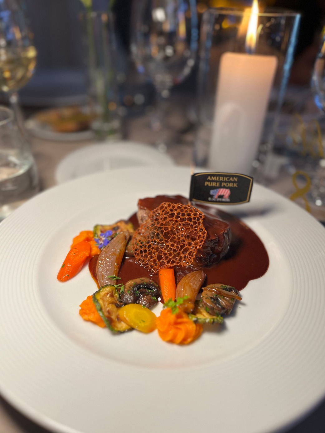 Después, una ensalada de osmosis de nopal baby servida con consomé de jitomates rostizados y un velo de cilantro. Para el plato fuerte, los asistentes pudieron elegir entre un un lomo de cerdo con mole de caderas, reducción de cacao, verduras salteadas y glaseadas, mousseline de camote y un falso de achiote; o un filete de totoaba sellado cubierto con salsa de chiles secos, puré aterciopelado de elote y papa, polenta cremosa, elotes baby rostizados y un crocante de chiles y maíz enchilado.